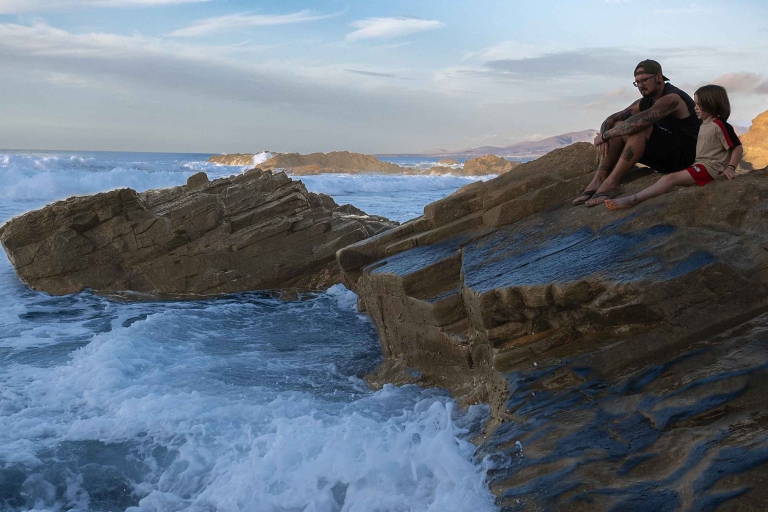 Vive una sesión de fotos muy especial en el norte de Fuerteventura, donde el viento cuenta historias y la luz del atardecer baña las olas con magia dorada.