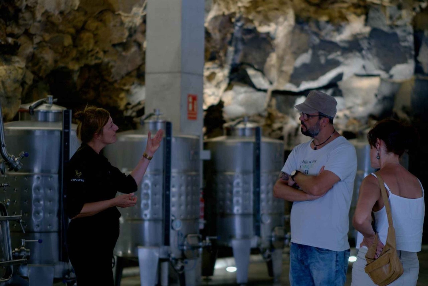 La experiencia empieza con un recorrido en el viñedo y sigue con la visita a la bodega excavada en la roca volcánica para terminar con la cata de tres vinos Conatvs, maridados con productos locales seleccionados, en un ambiente relajado y encantador.