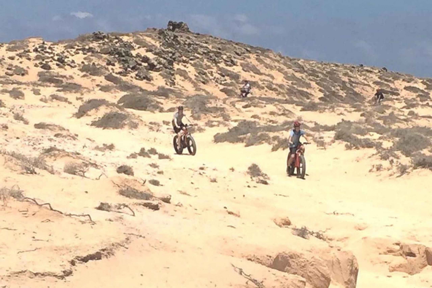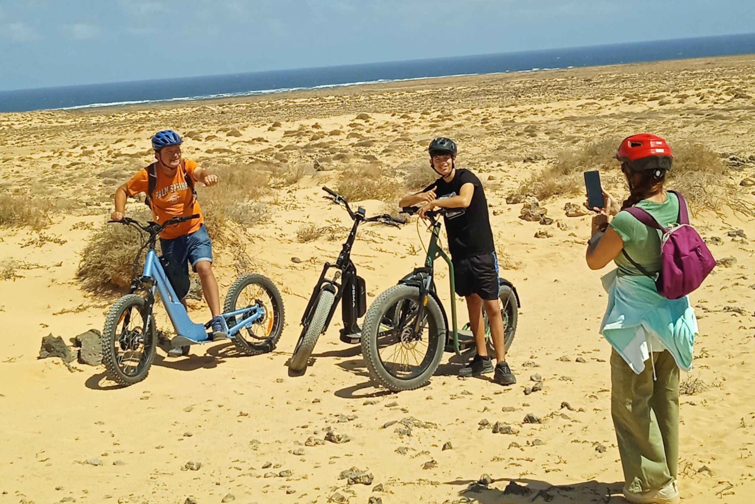 Il tour inizia con l'accesso alla Catena Vulcanica del Nord visitando i crateri Bayuyo e Calderon Hondo, i crateri più iconici e ben conservati del nord. Camminiamo per 15 minuti a Calderon Hondo e arriviamo a una balconata da cui si gode di una vista sorprendente del cratere stesso e della parte nord dell'isola. Il tour prosegue in direzione di Lajares e qui ci fermiamo in un piccolo bar, dove potrai rilassarti e bere qualcosa. La destinazione successiva è Majanicho, un piccolo villaggio di pescatori situato su una laguna con una spiaggia di sabbia bianca. La parte successiva è l'area di sabbia dove potrai goderti le gomme grasse della nostra fat ebike e dove potrai ammirare fantastici panorami. Da qui torniamo a Corralejo lungo l'oceano, con una sosta alla 'Pop Corn beach'. È un'esperienza di pedalata meravigliosa per tutta la famiglia! C'è la possibilità di fare questo tour anche con 2 e-scooter a motore.