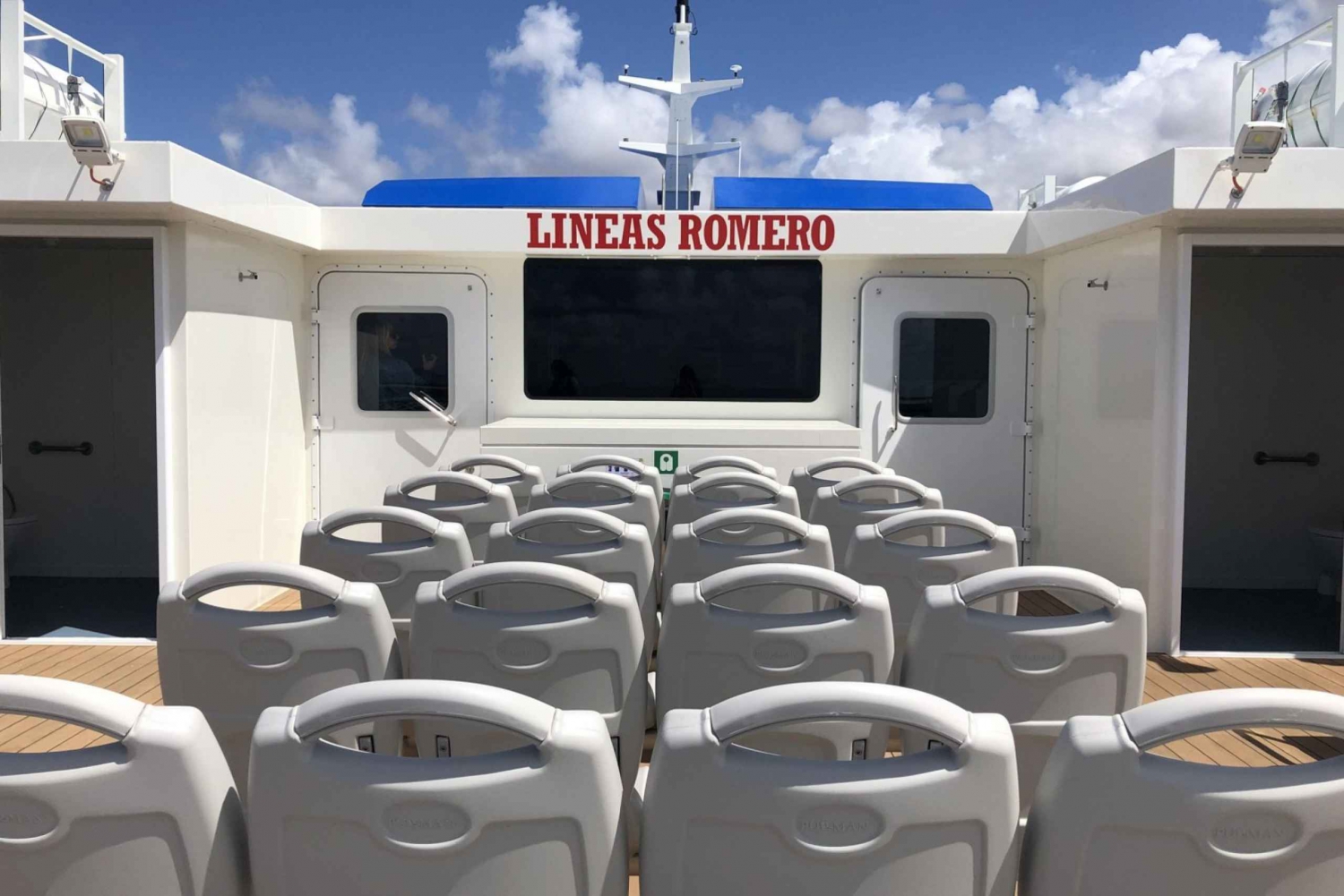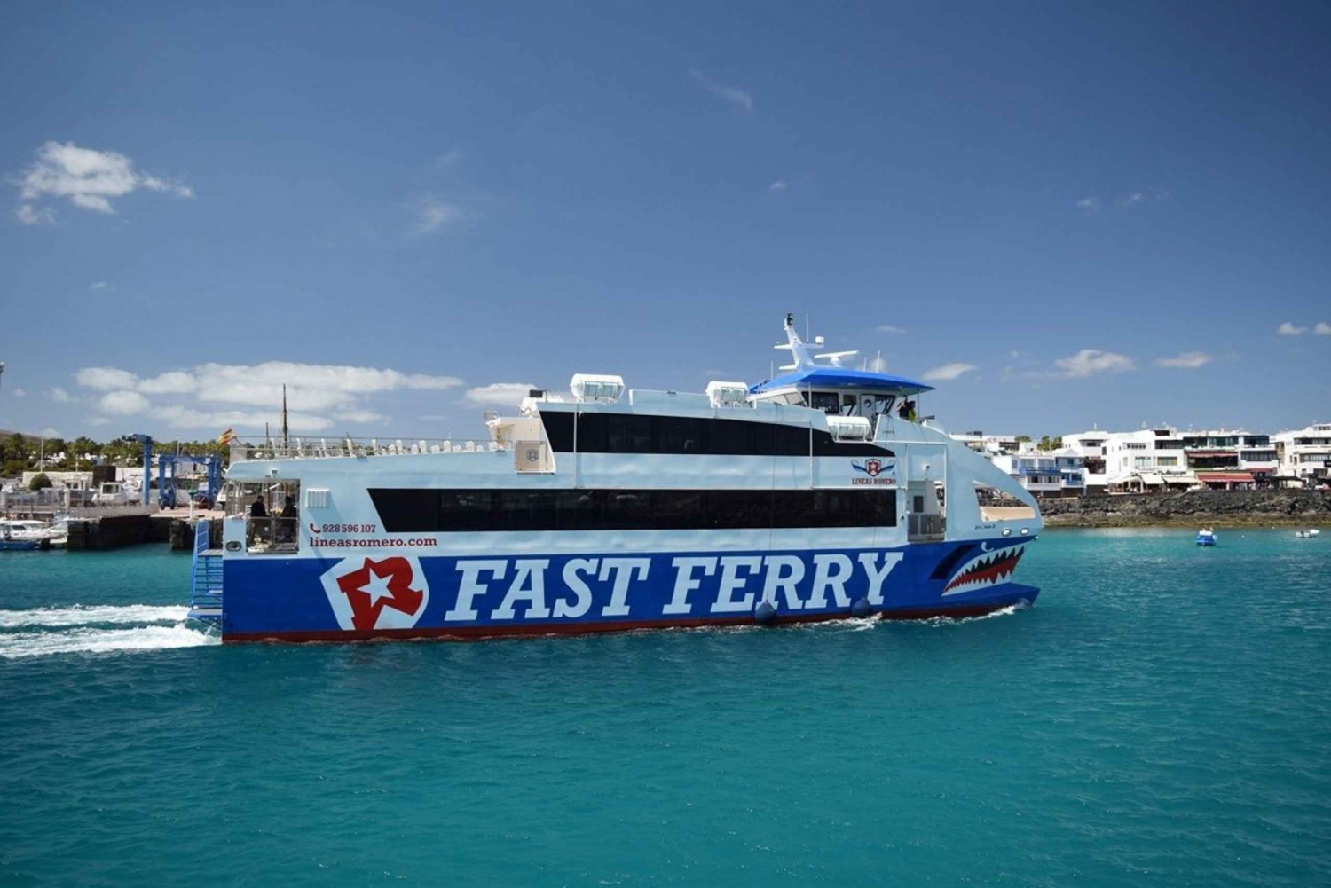 Parti da Lanzarote e raggiungi la vicina isola di Fuerteventura per un'escursione di un giorno. Per prima cosa, raggiungi in autobus il porto di Playa Blanca, a Lanzarote, e sali a bordo del traghetto veloce Lineas Romero per raggiungere Corralejo a Fuerteventura. All'arrivo, ricevi il benvenuto della tua guida esperta mentre sali a bordo di un comodo pullman con aria condizionata. Fai una prima sosta al pittoresco villaggio di pescatori di El Cotillo, dove potrai passeggiare sul lungomare e osservare il rollio delle onde. Scopri i luoghi più belli che il villaggio ha da offrire: passeggia per le sue strade, rilassati su una delle spiagge o visita il Castillo El Tostón, la torre costruita nel XV secolo per difendere la costa dai pirati africani, francesi e inglesi. Poi, fermati nel cuore della città di Corralejo per esplorarla a tuo piacimento. Scopri tutto ciò che la città ha da offrire, tra cui le stradine strette, i ristoranti di pesce e gli antichi cottage che risalgono all'epoca in cui la città era un villaggio di pescatori. Poi, recati alle dune del Parco Naturale di Corralejo per divertirti e scattare foto. Nel pomeriggio avrai un po' di tempo libero per goderti la favolosa spiaggia di sabbia bianca, dove potrai aumentare la tua abbronzatura o fare un tuffo nell'Oceano Atlantico. Torna in pullman al porto di Corralejo per il giro in barca di ritorno a Lanzarote. All'arrivo, sali a bordo dell'autobus di trasferimento per tornare al punto di rientro.