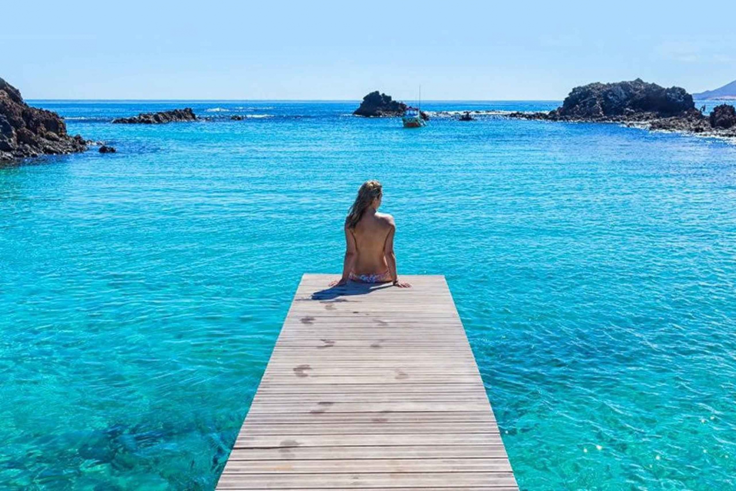 朝のお迎え後、バラデロ・プエルト・デル・カルメンまでエアコン付きバスで移動し、スピードボートに乗船。船上での生解説とピクニックランチをお楽しみください。 1.5時間の船旅でランサローテ島の海岸のパノラマを眺め、ロボス島へ。この地域に生息するイルカの航路をたどり、クジラやその他の海洋生物とともに、自然の生息地で愛嬌のある生き物を探してみましょう。途中、野生動物についての詳しい情報を得ることができます。 到着後、2時間半の自由時間を楽しみ、絵のように美しい小さな漁師の村や自然のラグーンを散策したり、火山の小道をハイキングしたり、この自然公園の手つかずのビーチで泳いだり、シュノーケリングを楽しんだりすることができます。 ボートに乗ってプエルト・デル・カルメンへ戻り、バスがホテルまでお送りします。